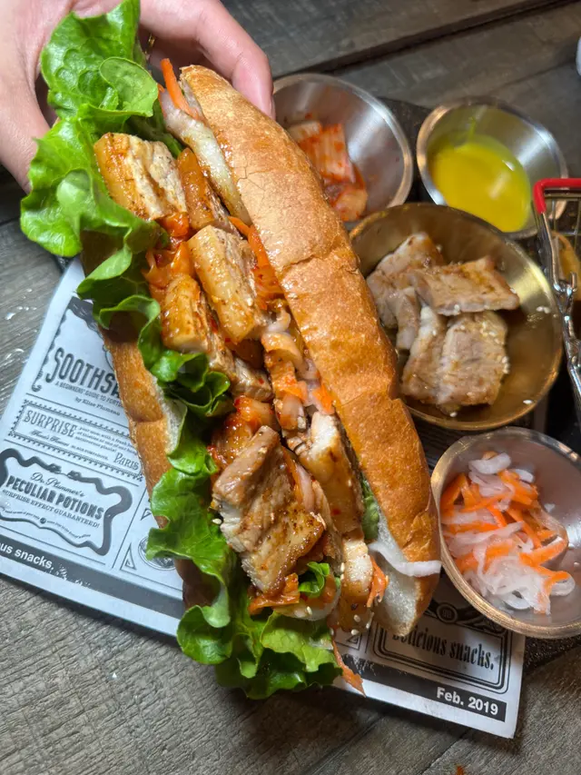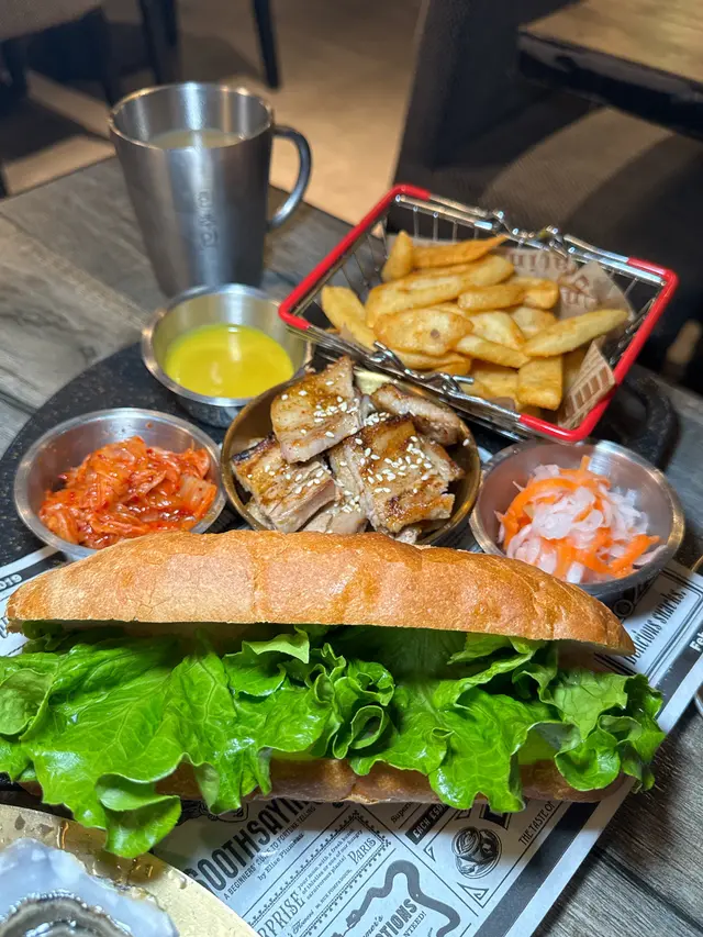 份量好多,可以因應個人喜好加入中意份量,配埋泡菜解膩,腩肉調味唔錯,Q彈唔肥,值得一讚法包質地外脆內煙韌,唔會硬繃繃