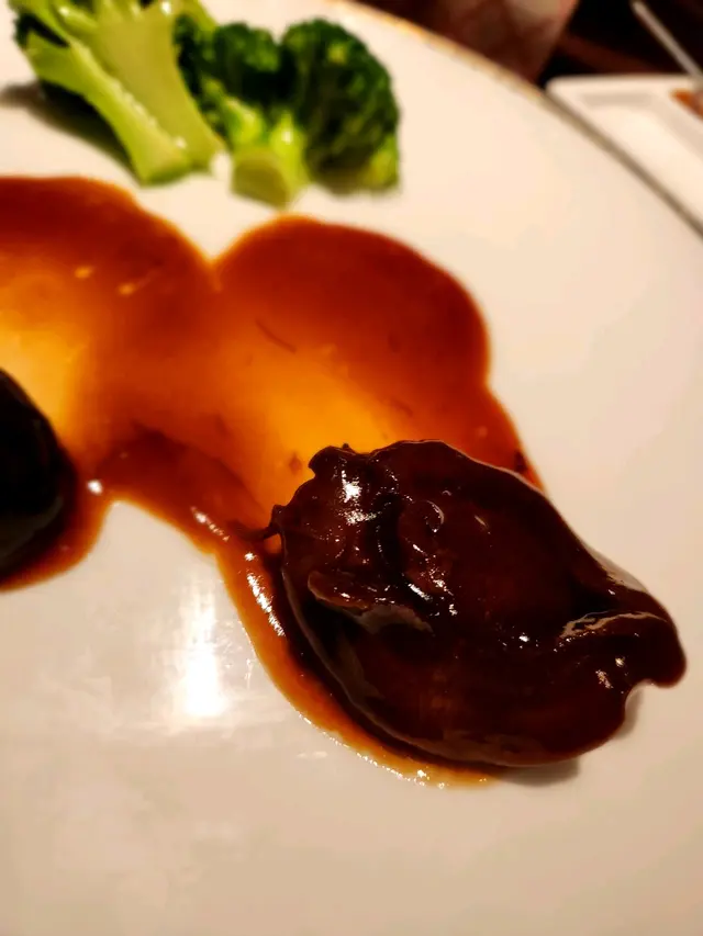 鮑汁鮑魚燴花菇, 鮑魚炆了很久,很軟身,花菇有滿滿的鮑汁,三樣食物一起吃,很夾。配在口中不一樣的感覺