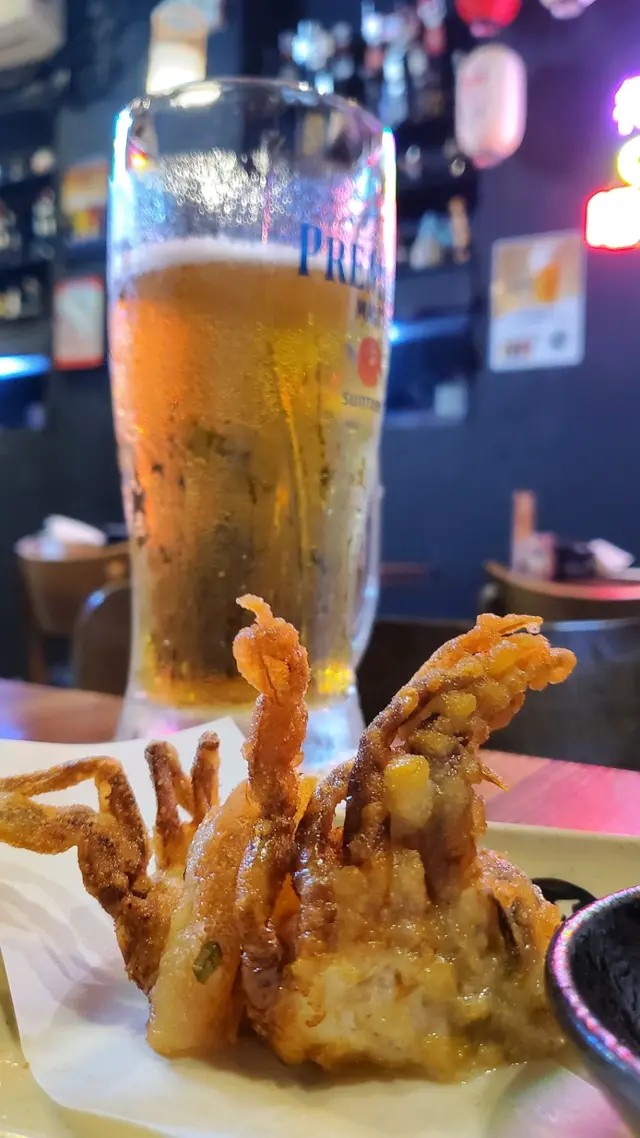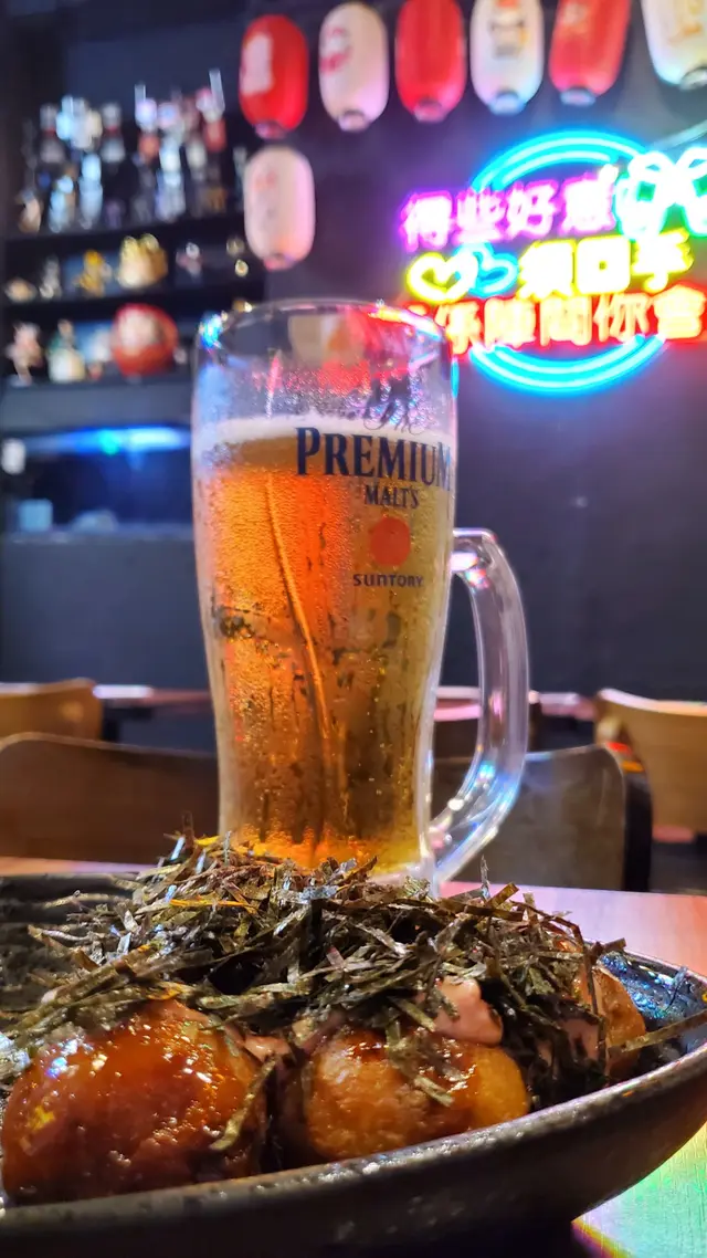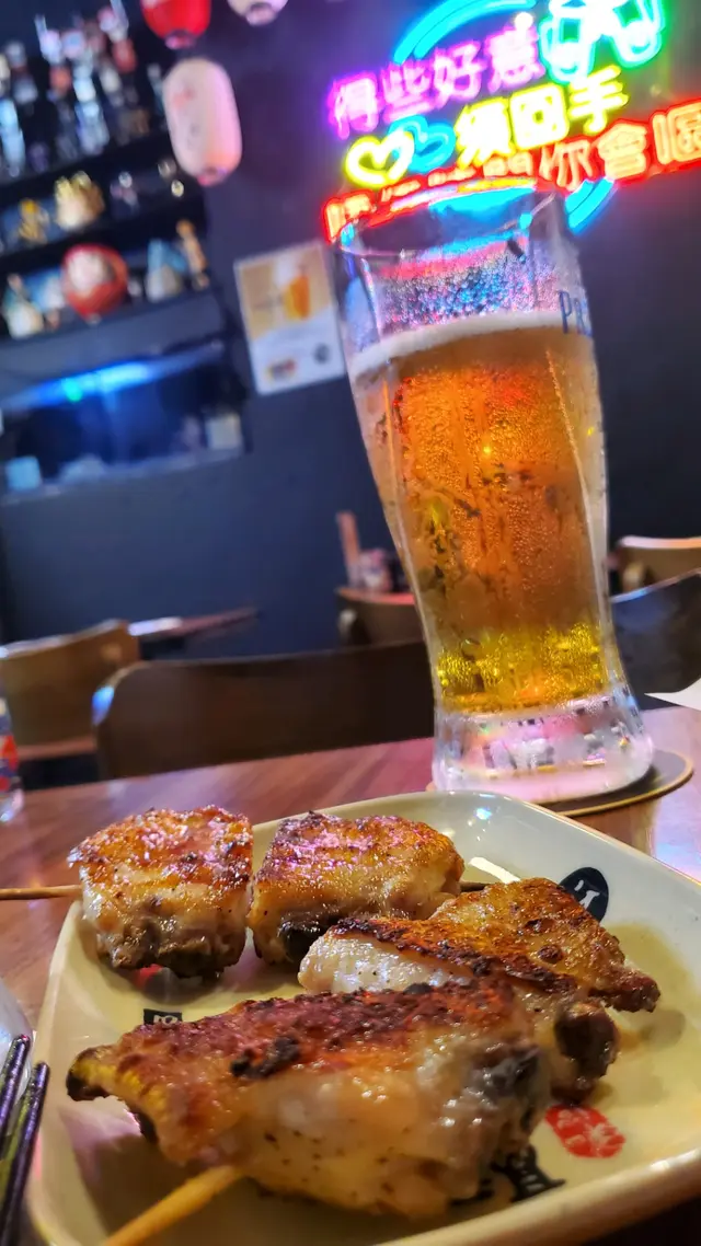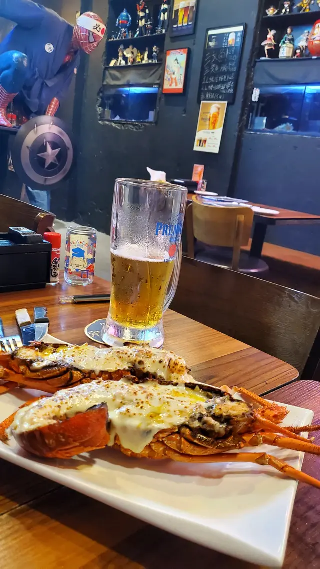 本身幫襯開另一間串燒店,覺得師傅燒得好味,最後一次去食物大變質,原來師傅走左。好彩g前有因為叫佢去街市買特別嘢食燒拎左電話,whatsapp佢原來去左呢間舖。新呢度環境更chill,有妹豬鍾意嘅燈牌打卡位。whatsapp師傅訂位時,佢話今日買左新鮮紅龍,咁一定要試啦,兩隻開四邊,試晒3隻味,芝士,牛油同鹽燒。芝士同牛油勁正,鹽燒咸左啲。其他叫左3杯大啤兩杯細啤,章魚丸,蜆,雞翼,雞皮,軟殼蟹,明太子,幾串牛肉(因為出左街外食煙,唔知朋友叫左咩牛)同燒菠蘿,燒菠蘿外面有層糖衣入面勁甜勁多汁(醉醉地無影到😅🤣),我嘅no.1推介。龍蝦我都唔知洗唔洗訂,想食就打去問問啦。