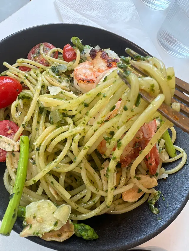 啖啖肉的虎蝦,爽口鮮嫩,以羅勒(九層塔)、蒜、橄欖油調製嘅青醬意粉,帶有清草香氣,吃得津津樂道。