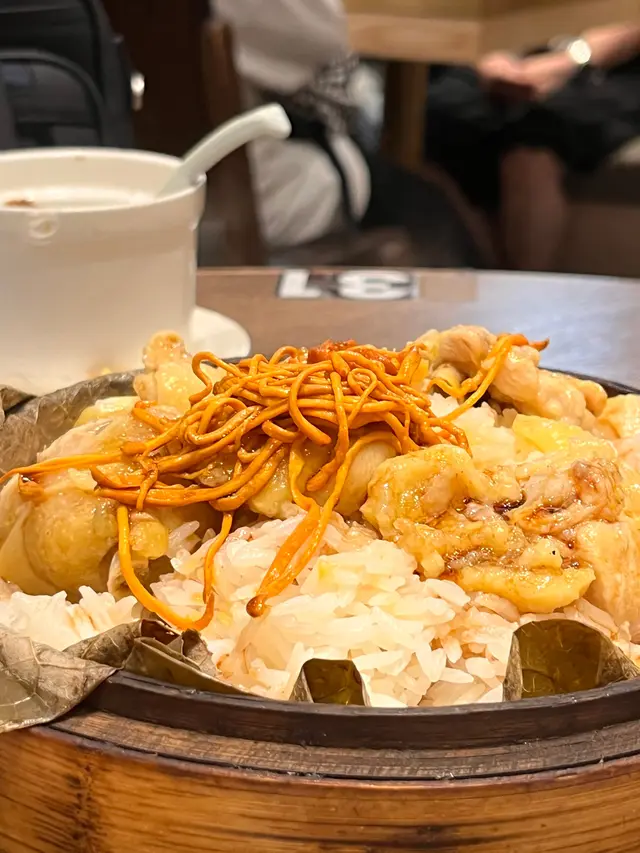 -輕輕揭開以荷葉作衣裳嘅〔蟲草花三黃雞籠仔蒸飯〕,