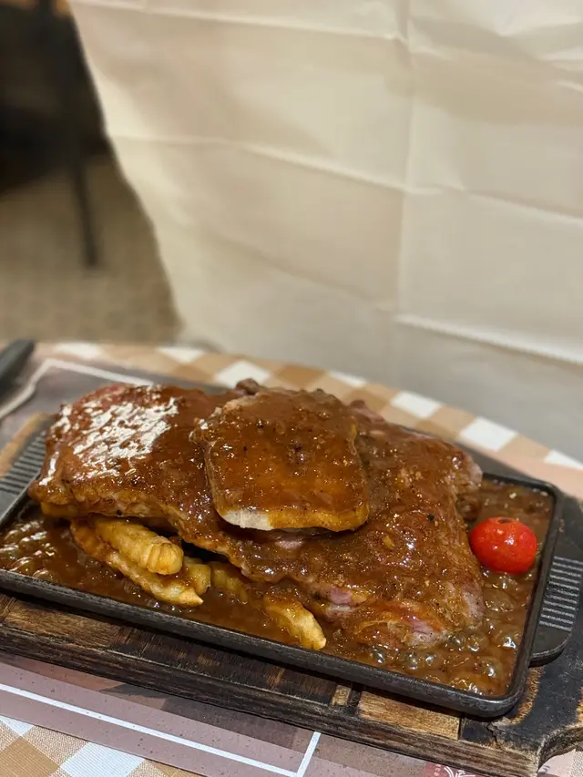 同老公share食,另一款就叫咗西冷牛扒,肉味比較香濃,由於懷孕期間就只能夠嗌全熟但都無阻我對呢份鐵板嘅喜愛。好厚肉好有水準,重點係底部嘅薯條🍟