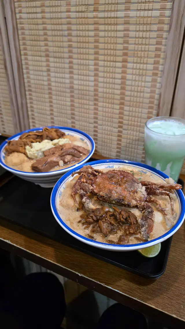 2款湯底其實是一樣, 只不過1款加了榴槤, 首先湯底無添加味精的情況下味道可算濃郁, 帶重椰奶味, 而且濃而不濁 ☺️ 加了榴槤之後會跟椰奶2合為1, 榴槤味雖然突出, 但未至於搶走所有味。原隻軟殼蟹非常巨型, 炸到酥脆, 加了大量蜆肉, 更有豆卜芽菜配搭起來。