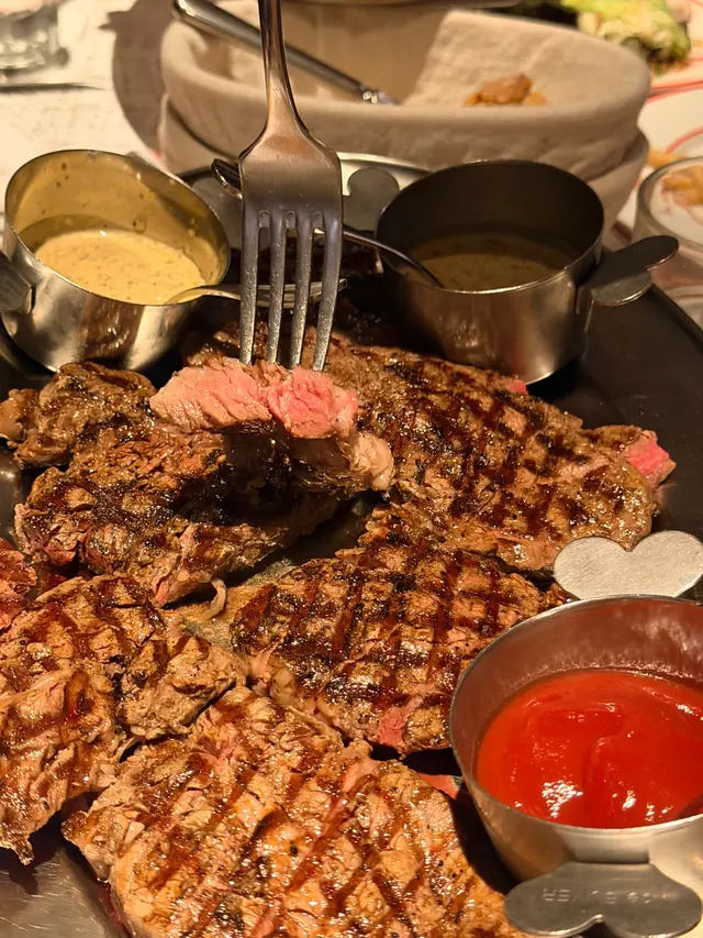 🥩USA Ribeye牛排八個人都叫medium,切開見到完美粉嫩色💗!外層焦香內裡肉汁飽滿,簡單蘸鹽已經足夠帶出牛味~雖然跟特製醬汁,但個人覺得原味更突出肉香!