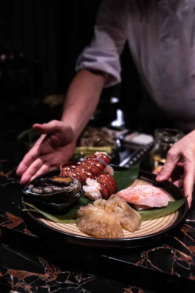 ✿ 青森県産蝦夷|雲丹:重頭戲之一的鐵板燒日本青森縣大鮑魚,加上以原片海膽做的芡汁、昆布及鮑魚肝。鮑魚足有臉蛋大,甚為驚人。