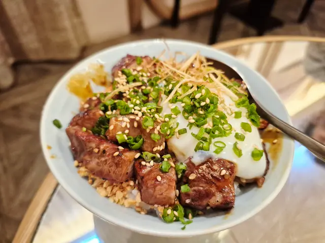火炙牛肉日本溫泉蛋丼:牛肉炙燒香氣撲鼻,蛋汁與醬汁完美融合,飯粒吸收精華。