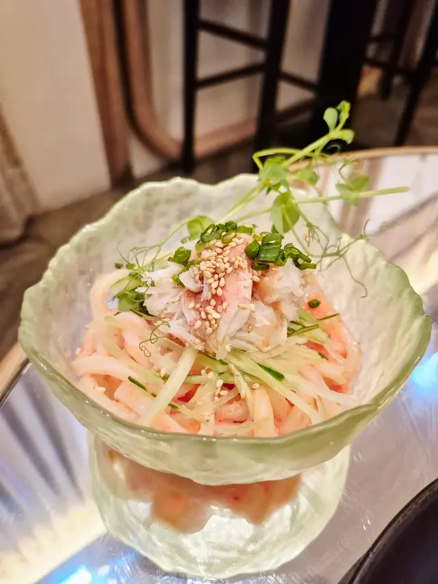 松葉蟹明太子冷烏冬:烏冬滑溜彈牙,蟹肉鮮甜,明太子鹹香點綴,夏日必選。