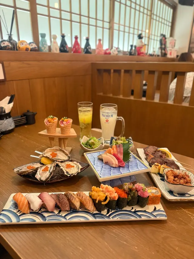 最開心係任食12款即握壽司,師傅即場握,米飯軟糯,食唔夠仲可以再點!🍣💖 野菜盤清脆爽口,溫泉蛋紫菜飯蛋黃流心,溫泉蛋稻庭烏冬彈牙有勁道🍚🍜。頭盤贈送和風沙律脆生生、五色刺身海膽甜筒創意十足、海膽鮮甜、雪糕球解膩!🍨🌟