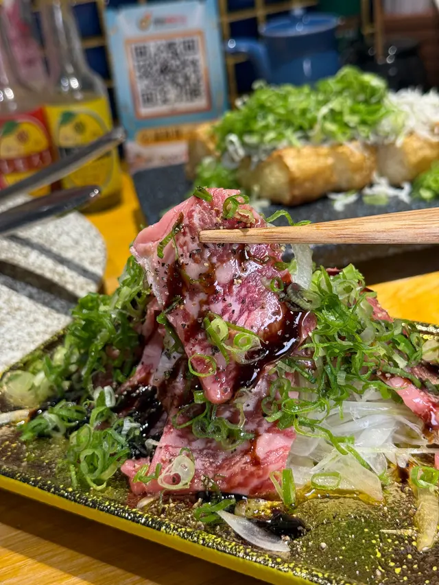薄切生和牛,油脂均匀~ 鋪滿洋蔥絲同蔥花,再淋上甜醬油提鮮,味道好夾,層次豐富而且清新醒胃 🥰