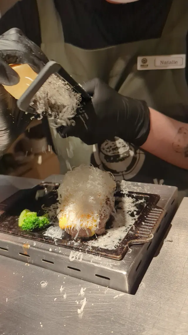 原味漢堡排肉汁飽滿, 煎得香口不乾. 芝士款除左鋪左cheddar cheese, 店員仲會即時刨滿滿芝士係頂, 拉絲效果一流, 芝香不膩. 一邊燒溶左係鐵板芝士會變左金黃香脆芝士片