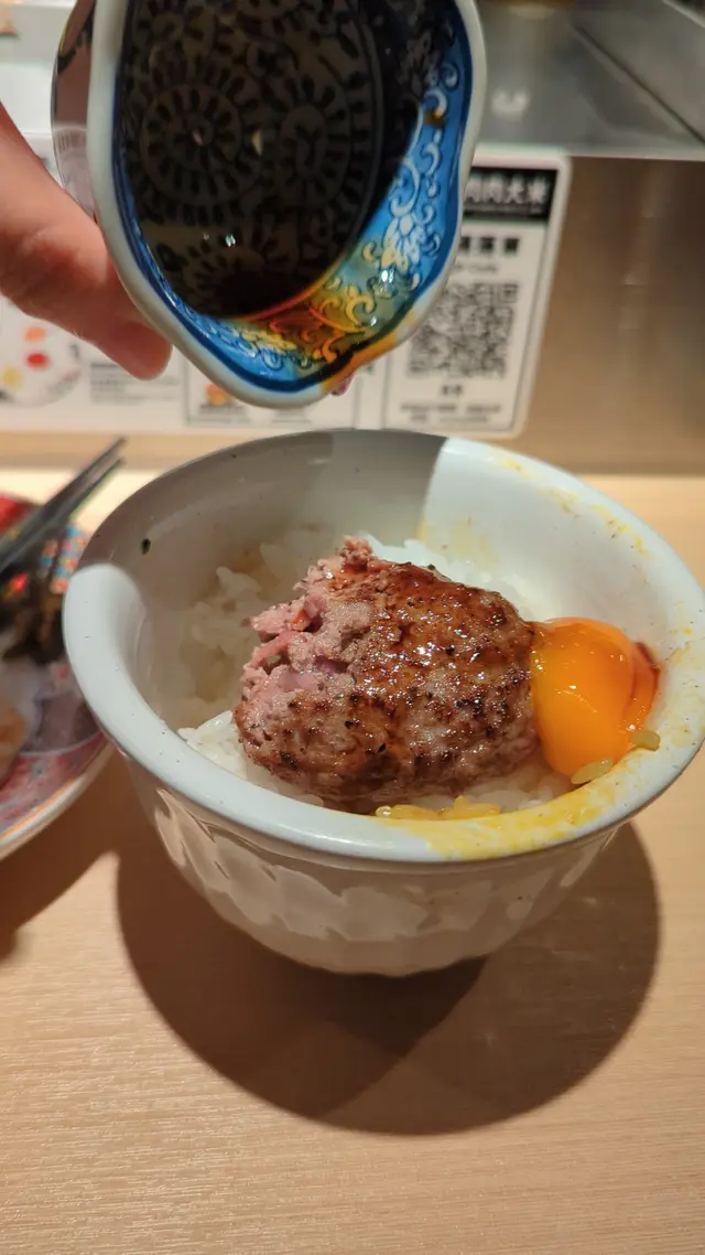 每個set 無限供應西蘭花、足料味噌湯(有菇又有魚蛋)同白飯. 用左日本米, 口感軟硬適中飯香濃郁, 配肉配醬汁都一流. 每set 仲配左隻蘭王蛋黃, 我嘗試把蛋黃倒係patty 上, 但發現極難, 都會滑左係隔離🤣