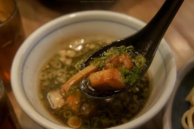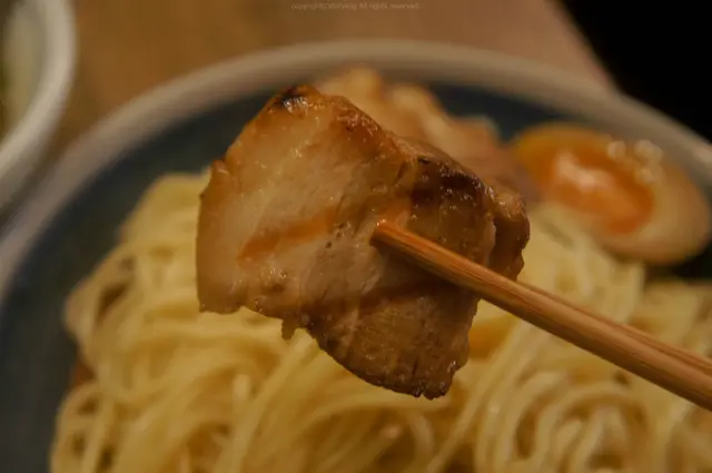 沾汁當中還有角切的燒黑豚肉、香蔥和脆筍~十分豐富的呢!