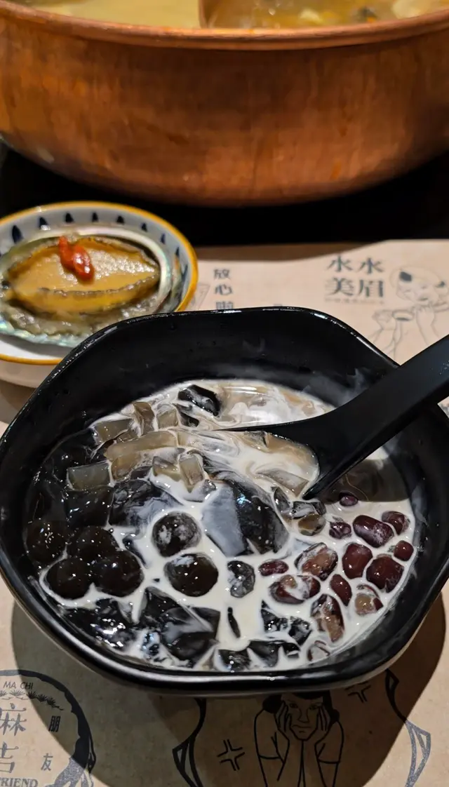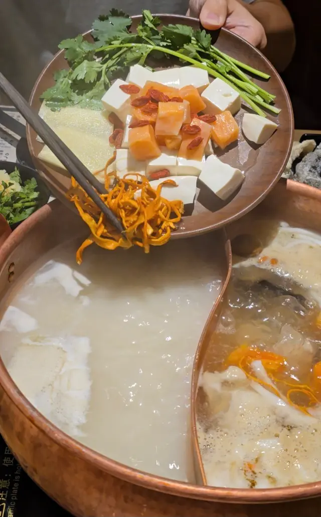 湯底選擇了鴛鴦鍋,其中一邊選了木瓜椰皇嫩雞鍋,另一邊選擇了雪白御鮮豆腐鍋,湯底真材實料,少鹽少油。前者木瓜超甜,並散發著椰皇的香氣,美味!豆腐鍋的湯底很清,內有好多三文魚。先以三文魚慢熬高湯,然後加入百福硬豆腐,魚湯鮮甜,兩款湯底皆滿意👍🏻