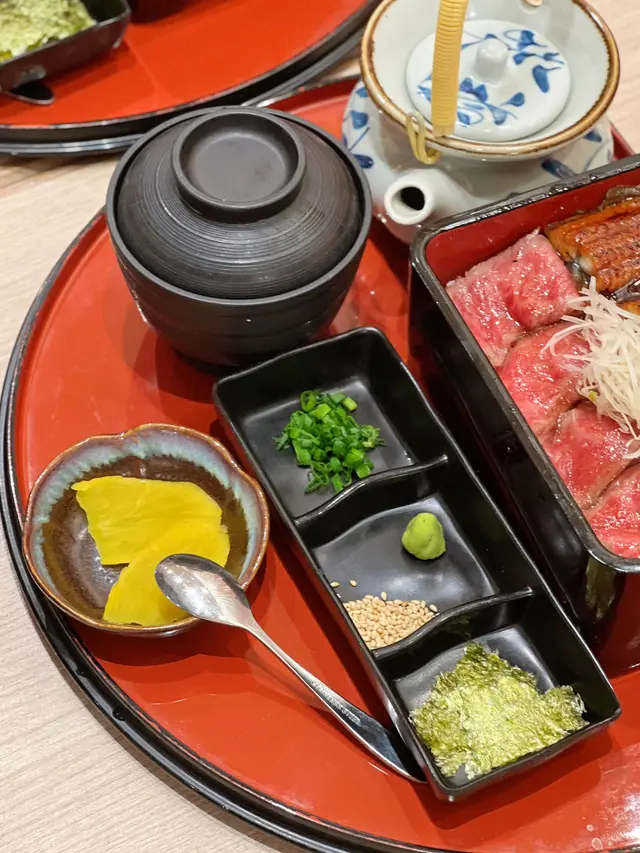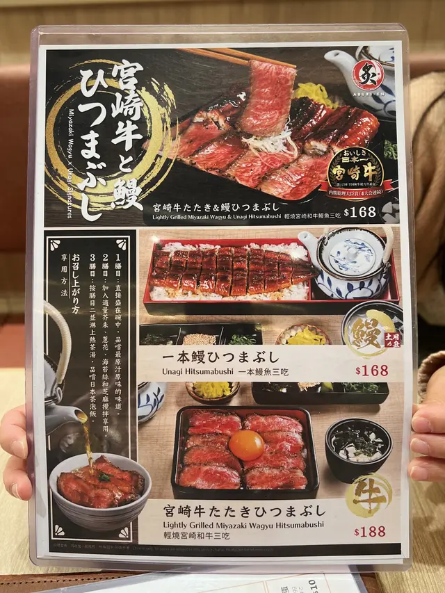 全新推出的宮崎牛X鰻魚三吃系列,一次過品嚐三種食法,先品嚐原汁原味,再加入芥末、蔥花及海苔絲和芝麻攪拌均勻,最後,淋上熱茶湯變成茶泡飯。