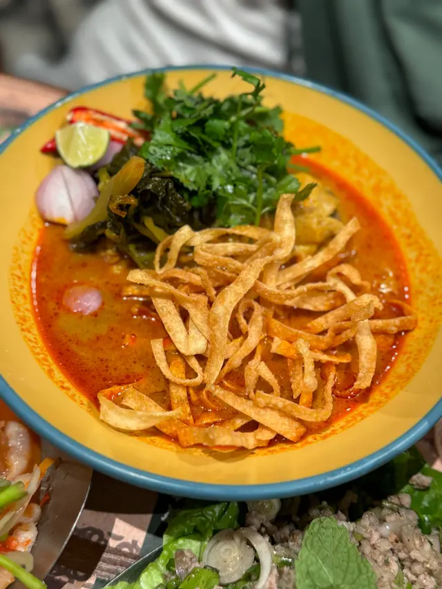 這碗麵的咖喱香氣撲鼻,湯底濃厚,雞肉軟嫩,配上新鮮的蔬菜,讓整體口感更加豐富。每一口都能感受到泰國的獨特風情。