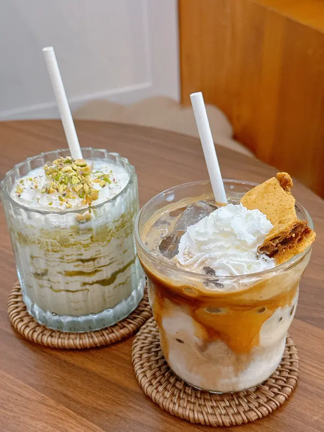開心果拿鐵是店鋪的人氣飲品🥰濃郁的開心果香氣與奶香完美結合口感滑順🍵要把開心果醬攪勻飲 喝到開心果粒粒增加口感