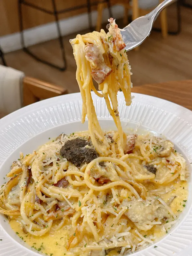 黑松露卡邦尼意粉做得好出色🍝醬汁充足濕潤黑松露香氣濃郁🥚🧀配搭上濃郁芝士及蛋香的卡邦尼意粉🥓加入煎得焦香的煙肉及蘑菇🍄🟫整體味道豐富層次分明