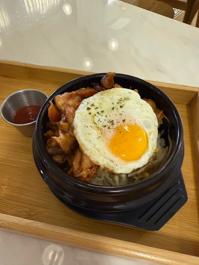 石鍋非常夠熱,入面有一隻煎蛋、泡菜同雞腿肉。再配上韓式辣醬,非常惹味健康。
