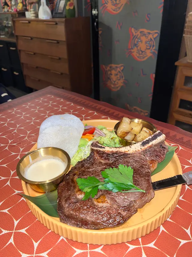 肉眼偏薄身 肉質香嫩 配菜除咗有沙律菜 竟然有燒菠蘿同蝦片(兩樣都係我fav 即刻加個靚分先٩(ˊᗜˋ*)و.ᐟ.ᐟ白胡椒香茅忌廉汁特別 挺惹味 成件事即刻由「西」變「泰」feel^_− ☆
