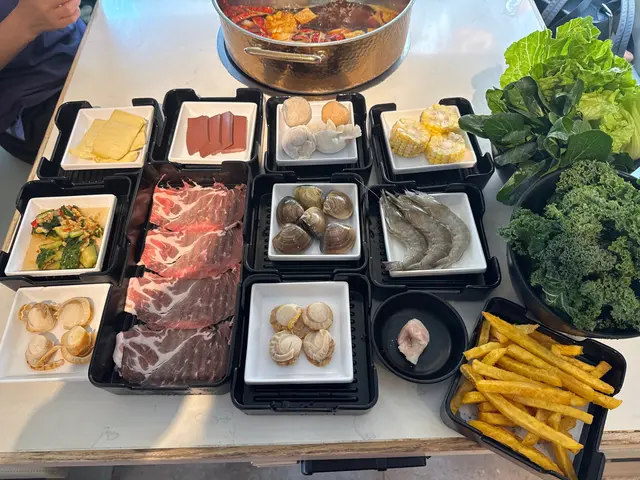 主角方面,Prime牛頸脊雪花均勻,輕輕一淥已經好軟嫩,牛味濃得嚟唔膩;伊比利亞黑毛豬果然名不虛傳,肉質爽甜,完全冇豬膻味。海鮮拼盤有蝦、蜆、魷魚等等,樣樣都幾新鮮,尤其係蝦,爽口彈牙!其他火鍋料同蔬菜款式都多,擺得整整齊齊,自助區乾淨。