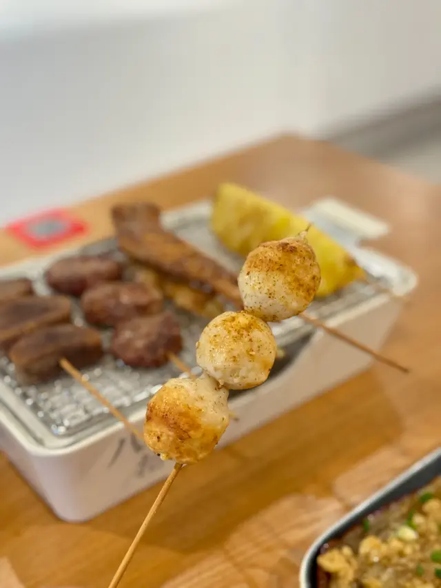 烤台灣花技丸:外脆內軟,花技丸帶墨魚粒的顆粒感,有咬口同時品嘗到墨魚鮮味。