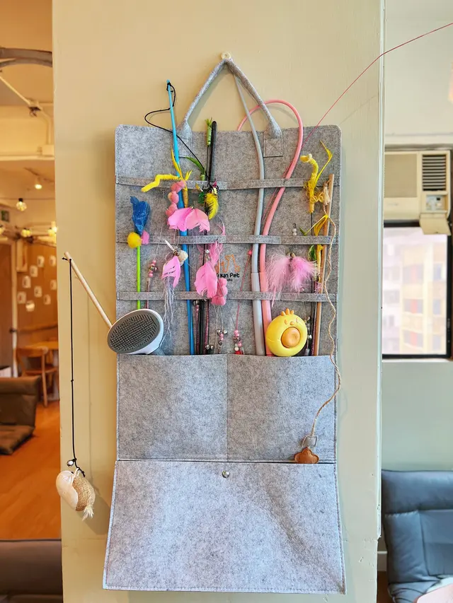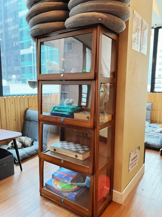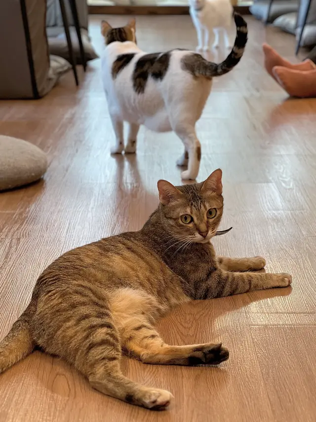 環境寬敞舒適,裝潢以簡約的木系為主,有特色的露營帳幕,座位以榻榻米為主,能近距離與貓咪們互動,亦提供貓玩具及桌遊等。