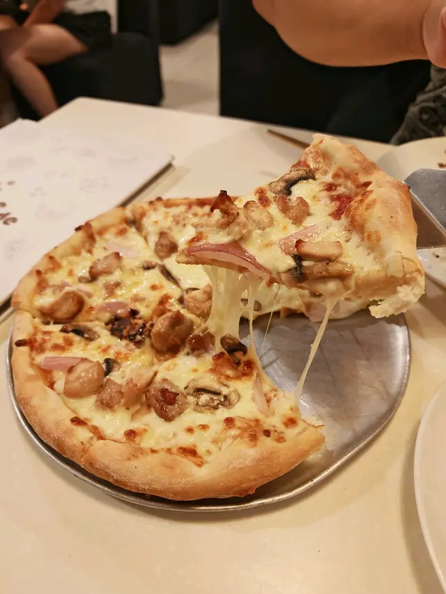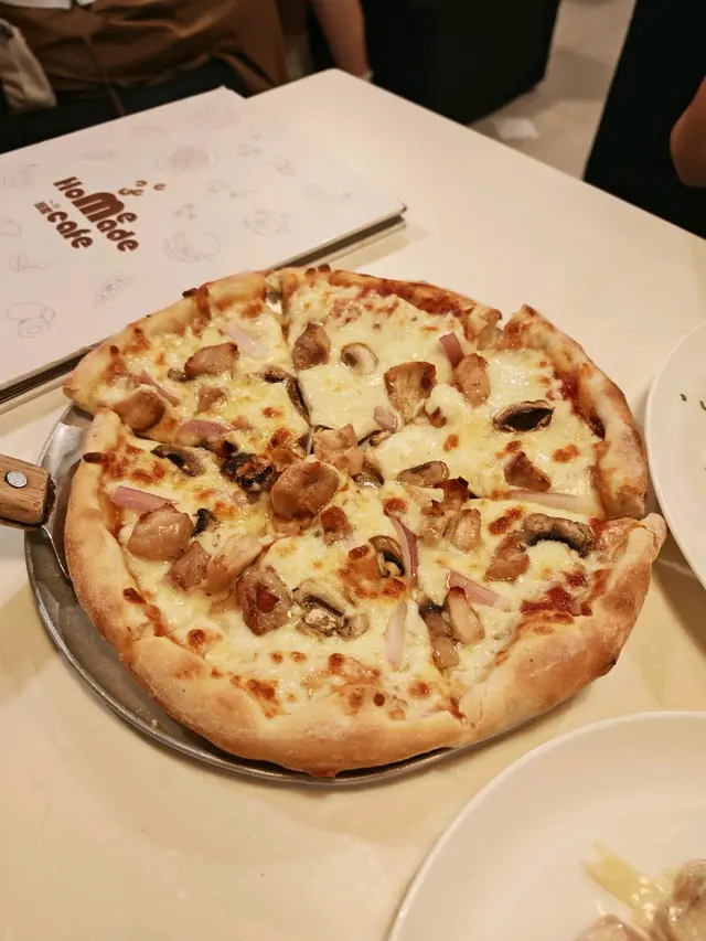 手拉pizza製作相當認真, 有雞肉、蘑菇等配料, 入口非常鬆軟。