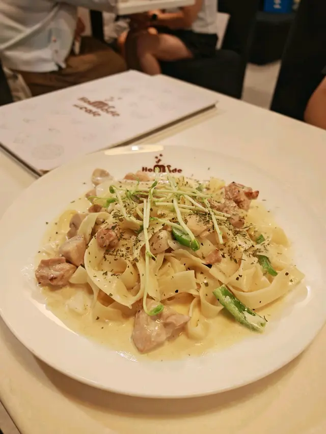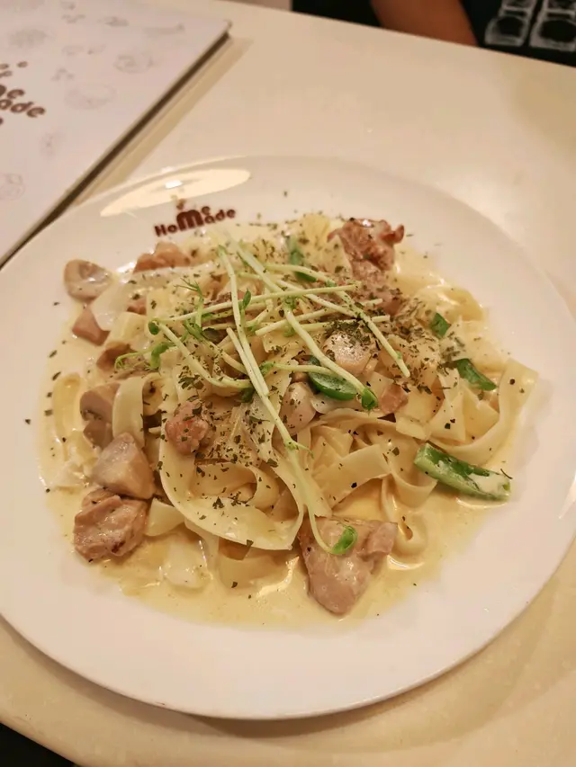 有烤雞肉、蘑菇、洋蔥、香草等配料, 忌廉汁都幾creamy, 寬條麵味道不錯。