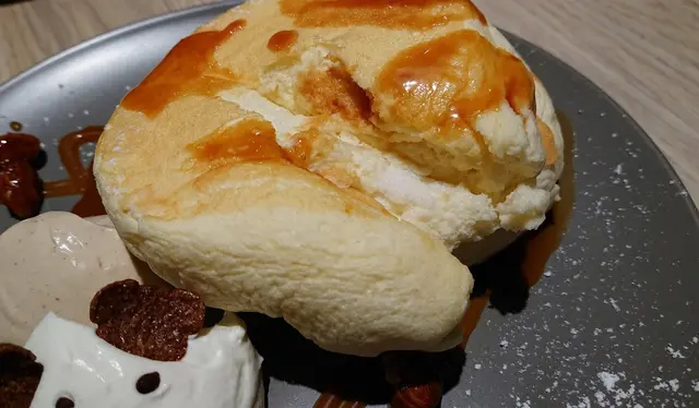 最後主角嚟啦, 焦糖梳乎厘班戟 (+HKD58 升級), 除了配有焦糖醬可以給大家配吃梳乎厘班戟外, 旁邊另有海鹽Cream 及Earl Grey Cream, 鬆軟無如雲朵一樣的梳乎厘班戟, 但質感絕不會像雲風一樣, 食落去充滿住質感, 而且帶有蛋香味道, 一口點上焦糖另一口點上海鹽Cream 或Earl Grey Cream中和焦糖的香甜感覺, 加上幼滑的海鹽 cream 及Earl Grey Cream, 那就令到整個梳乎厘班戟味道層次大大提升啦~