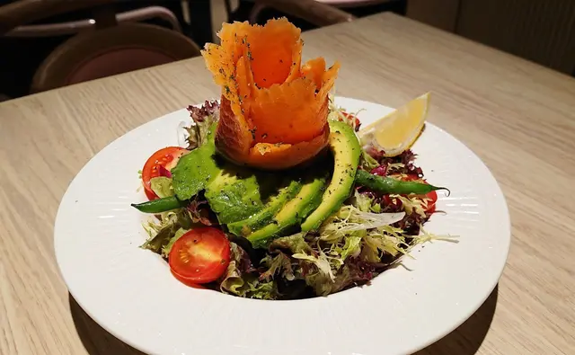 前菜是白湯及煙三文魚牛油果沙律, 分量都頗大, 煙三文魚厚身之餘油脂感十足, 加上沙律本身配以沙律醋等酸性來中脂感, 加上牛油果本身都是較有飽肚感的蔬果, 所以我食完都有啲飽飽哋