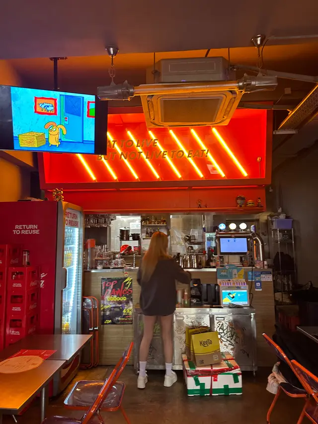 今日同老公喺旺角拍拖二人世界,喺旺角附近有間漢堡包店一直都想試,就入嚟試吓!除咗漢堡包,佢嘅環境真係超打卡好潮🤩店員都好cool😉🎸好似去咗Club咁🎙️門口歐美風格,橙色燈管嘅logo配上鐵拼鮮艷橙色牆身,已經超級吸睛😍入到去兩面牆都充滿歐美塗鴉壁畫!完美展現到店舖嘅歐美風格!近門口仲有DJ音樂器材,相信夜晚應該好熱鬧🎸