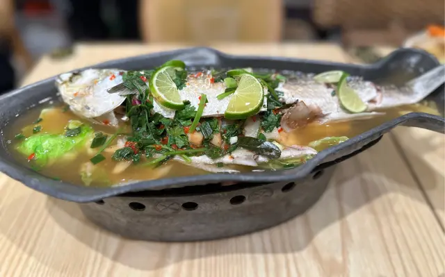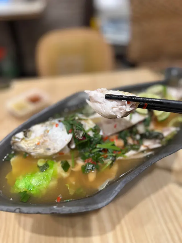 烏頭魚肉細嫩,青檸湯底酸香醒神,加入香茅、檸檬葉等香料,鮮甜開胃。