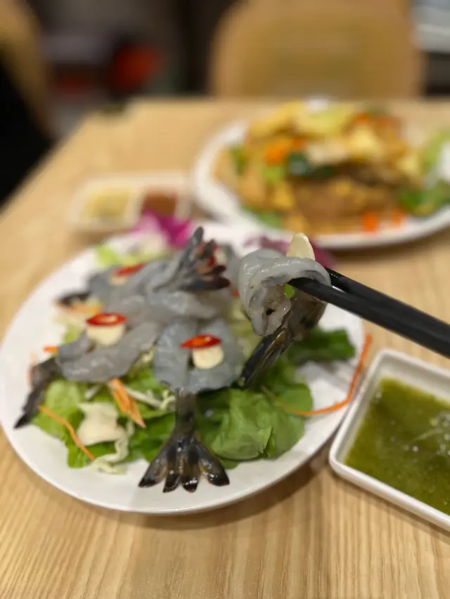 𝗖𝗿𝗶𝘀𝗽+𝗙𝗿𝗲𝘀𝗵!蝦肉爽彈鮮甜,蘸上酸辣醬汁與蒜片,風味十足,開胃首選。