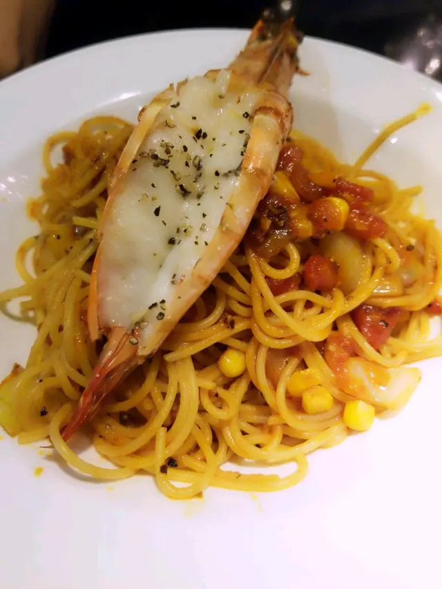 一睇我啲相你就知隻蝦有幾大隻?係非常之大隻(對於我嚟講), 我覺得好似係海蝦,食落都有啲爽 ,同埋蝦味濃, 食落去好似食緊龍蝦咁好正 !主角意大利麵啲蕃茄汁我覺得好似用咗新鮮蕃茄整 ,所以令到成個麵同 醬汁都好夾! 整體嚟講非常好食!
