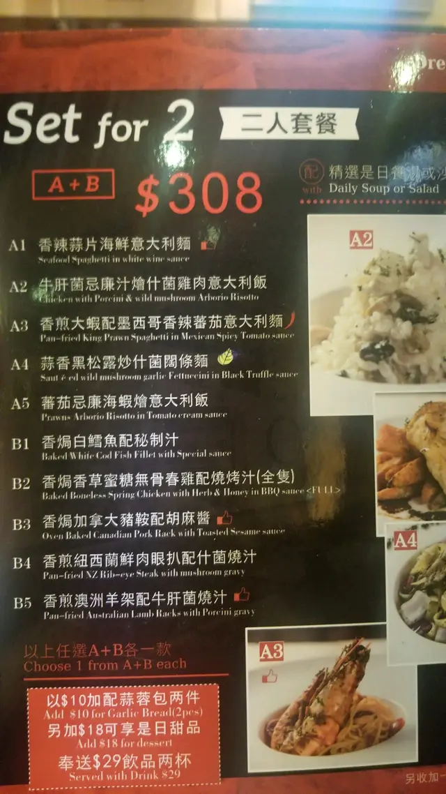 我哋兩個叫咗個二人套餐 ,分別是[香煎大蝦配墨西哥香辣蕃茄意大利麵]以及 [香煎澳洲羊架配牛肝菌燒汁]。 嘢飲我哋叫咗菠蘿芒果柚子沙冰及西沙冰。