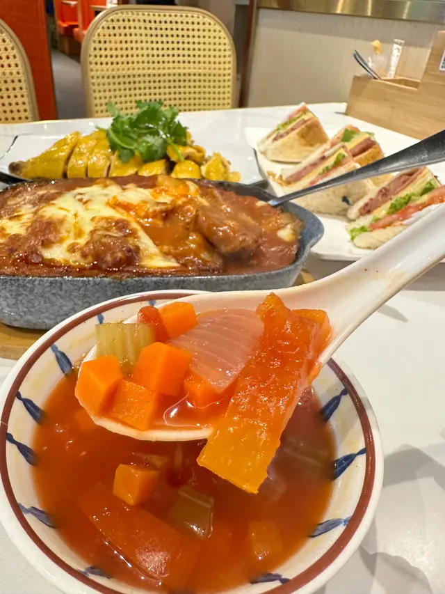 呢個係職員推介,佢話呢度嘅鹽焗雞🐔好好食,上枱個賣相真係好震撼🫣,半隻雞🐓嘅份量都幾多,仲配一大碗🍚飯,同一大兜好足料嘅🥣羅宋湯,佢啲雞🐓都幾新鮮,入口嫩滑吾乾身,而且調味適中唔會太鹹,食完真係飽到上心口。