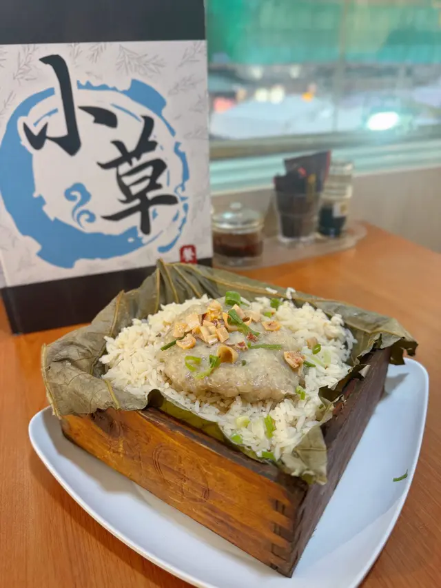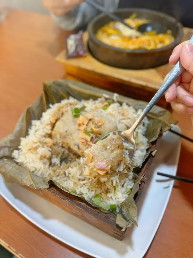 有網紅推介 𝗅𝗈𝗀𝗈 既籠仔荷葉飯,最後揀左土魷馬蹄香菇肉餅荷葉飯 𝖧𝖪𝖣𝟧𝟪 🌿 果然圖片只能信三成 😂 盒仔貌似高身厚底,結果 👧🏽 用力一督,篤穿左塊荷葉,飯量比想像中少,攪拌豉油時飯粒不斷向下跌 🤦🏻♂️ 肉餅厚身,內有馬蹄咬口爽脆;而土魷片十分隨機灑在肉餅上,加上少量蔥花作點綴 😬 整體上好一般