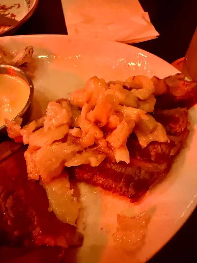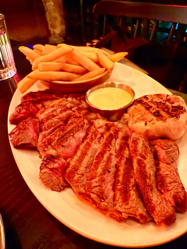正餐當然就係Grilled Angus Rib-Eye 10oz $328,3成熟嘅煮法,加$38可以upgrade做凱撒沙律,同埋有焗過嘅蒜頭同埋薯條,薯條唔夠食仲可以添,蒜頭放上牛扒一齊食好滋味,仲有唔同嘅醬汁配搭,好有fusion嘅感覺