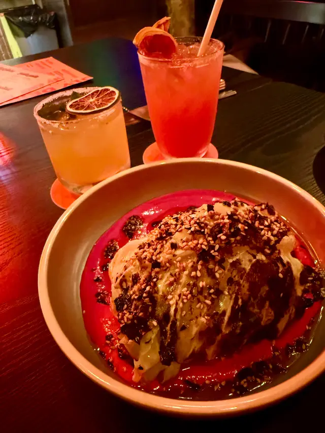 嚟到酒吧餐廳點可以唔試吓啲drinks呢,揀咗一杯Cocktail一杯mocktail, 可以坐響吧枱面前睇住調酒師整,睇得又飲得,前菜揀咗一個Charred Cabbage $98, 呢個情況好有驚喜,用咗紅菜頭乳酪做醬汁,配上辣椒,出奇地夾,食完都想點晒啲汁佢。