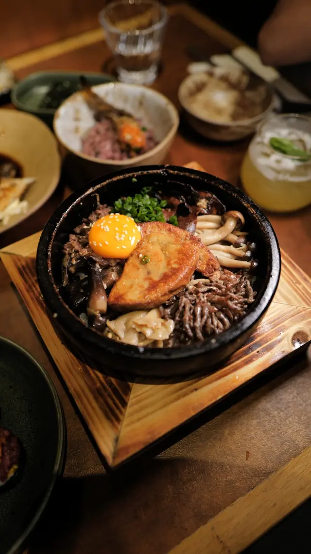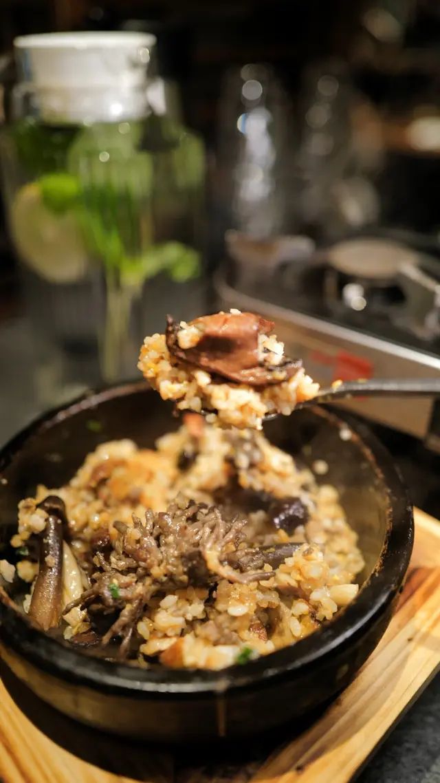 * 時令秋菌散發獨特香氣,法國鵝肝油潤甘香,在熱石鍋中拌出暖心滋味, yummmy。
