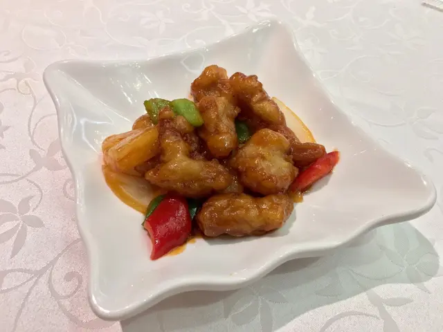 半肥瘦豬肉切丁粒後炸香,加入青紅椒、菠蘿等等,酸酸甜甜好開胃