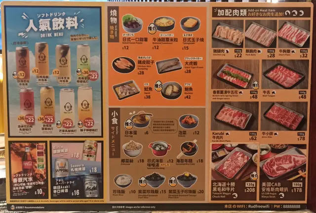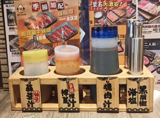 桌上提供三款醬汁(柚子蒜蓉汁、辛辣檸檬薑汁、燒肉汁),海鹽,黑胡椒,適量點可提升味道。