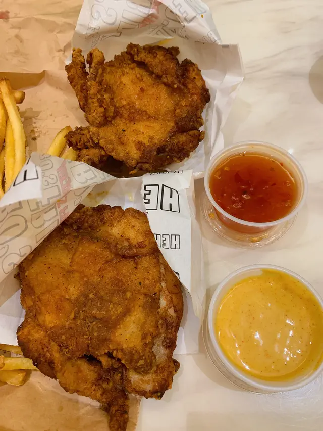 最好食是漢堡包 tongmoon等级42022-10-0997 浏览 关注 成日食連鎖店漢堡薯條,食都無乜新意,經過這間個名幾特別,就買回家試吓👇🏽只是買咗兩個漢堡套餐和兩件炸雞,無諗過啲薯條可以多到咁誇張😬但一食第一條,覺得外面好硬,繼續食多幾條,就發現差不多條條都好乾和偏硬,真的食唔到落去🥲炸雞配咗兩款醬,一款是泰式甜酸醬,另一款是有啲特別的,佢寫個名是Hero’s 醬,有啲似蜜糖芥茉味。兩件炸雞都是雞上髀,外皮較乾身,要食中中間位咁上下就開始有肉汁,但偏咸,越食越咸,只食了2/3😌煙肉芝士漢堡,塊漢堡夠厚,都幾多肉汁,最喜歡食手製漢堡,配埋一大塊生菜一齊食,好清新。另外個漢堡餐叫咗芝士漢堡,都一樣好食😋以上食记乃用户个人意见 , 并不代表OpenRice之观点。赞好分享最好食是漢堡包 Hero's Friday (黃埔新邨) https://s.openrice.com/QrLT0IRH500检举 张贴 评分3味道4环境4服务4卫生3抵食用餐日期2022-10-05用餐途径外卖自取用餐时段晚餐