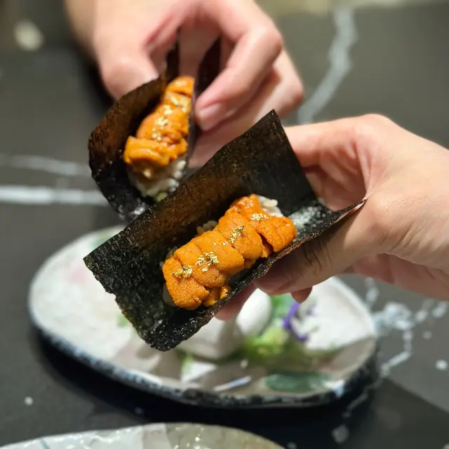 ▶︎ 根室馬糞海膽手卷 搭配上些許金箔點綴~