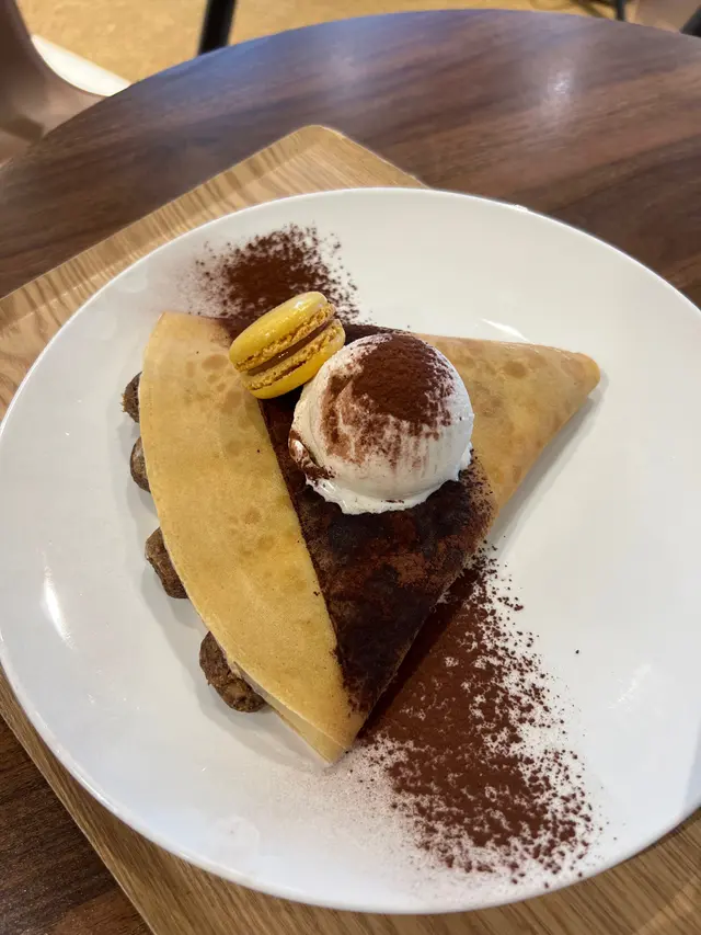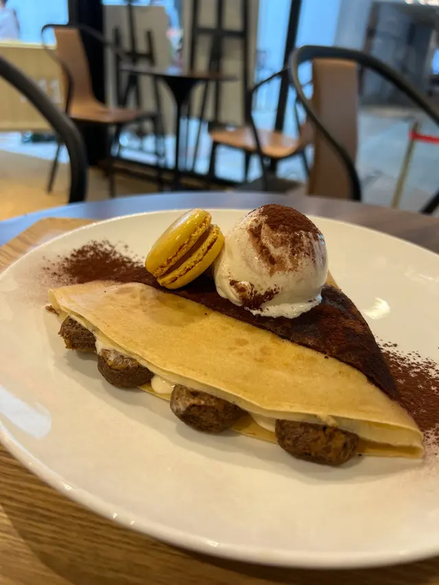 呢款係甜味既可麗餅,見到好多人都揀,我又試下,餅皮上有檸檬味既馬卡龍同雲呢拿雪糕,再加上可可粉,餡料係冧酒咖啡手指餅,酒香味好重又唔會太甜😋