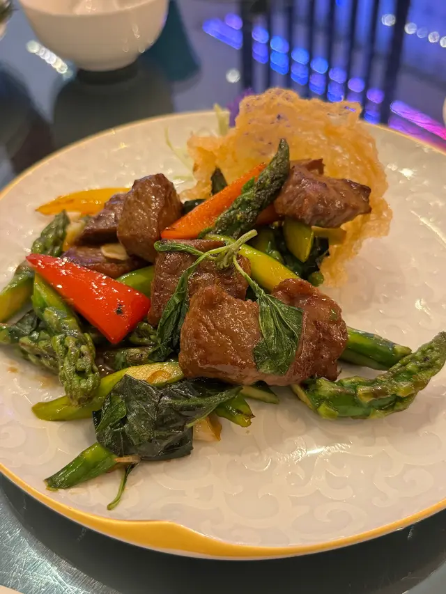 和牛粒煎至五分熟,盛在酥脆金盞裡,羅勒提味