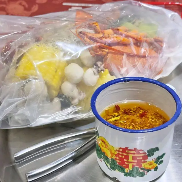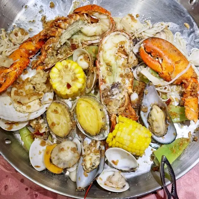 海鮮袋😍入邊十分之豐富,有波士頓🦞龍蝦、北海道🇯🇵元貝、鮑魚、沙白、青口同埋🌽粟米,配埋個蒜蓉🧄醬好新鮮美味!