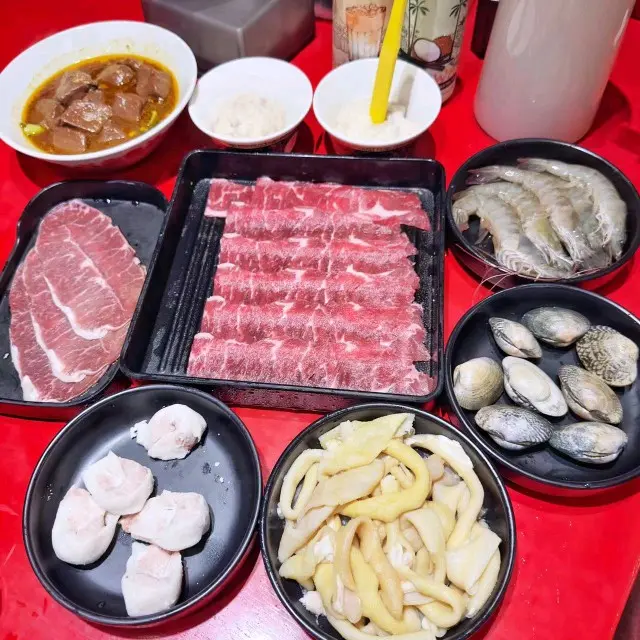 火鍋🍲放題當然唔少得🥩牛肉,B餐主打美國🇺🇸安格斯牛頸脊🐂任食,油花豐富均勻❤️深得我心。呢度嘅🦐海鮮類火鍋配料🥢亦都幾新鮮,仲有手打🦑墨魚/鮮蝦滑都係必食,而且仲有我鍾意嘅爽脆鵝腸添!