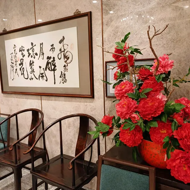 大紅牡丹花,大幅字畫,雕花裝飾一樣不缺,桌椅都是紅木家具,