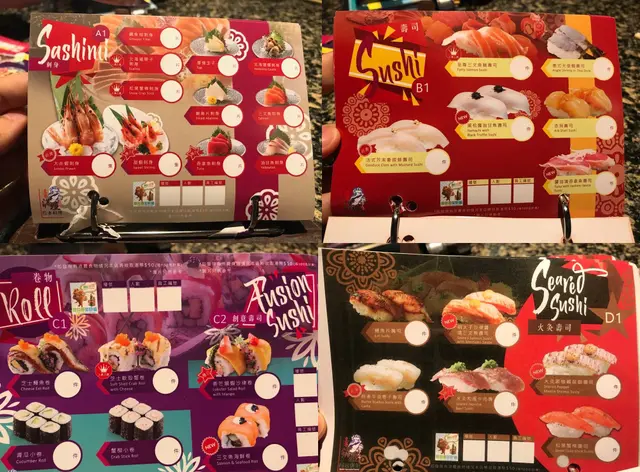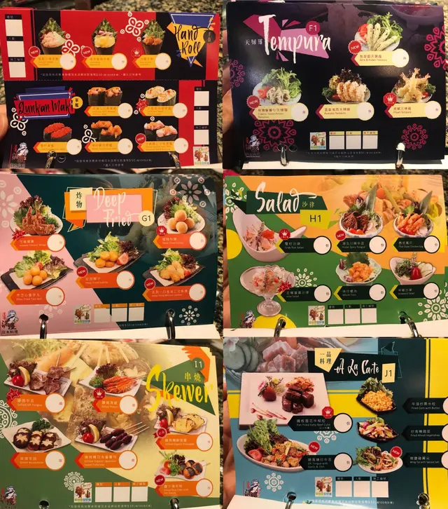 有A-M即13張紙可任點,A-E係冷盤即壽司、刺身類,而F-M就係熱食、串燒、炸物類。相比下,呢間既熱食種類比冷盤多好多,仲有特色飲品。